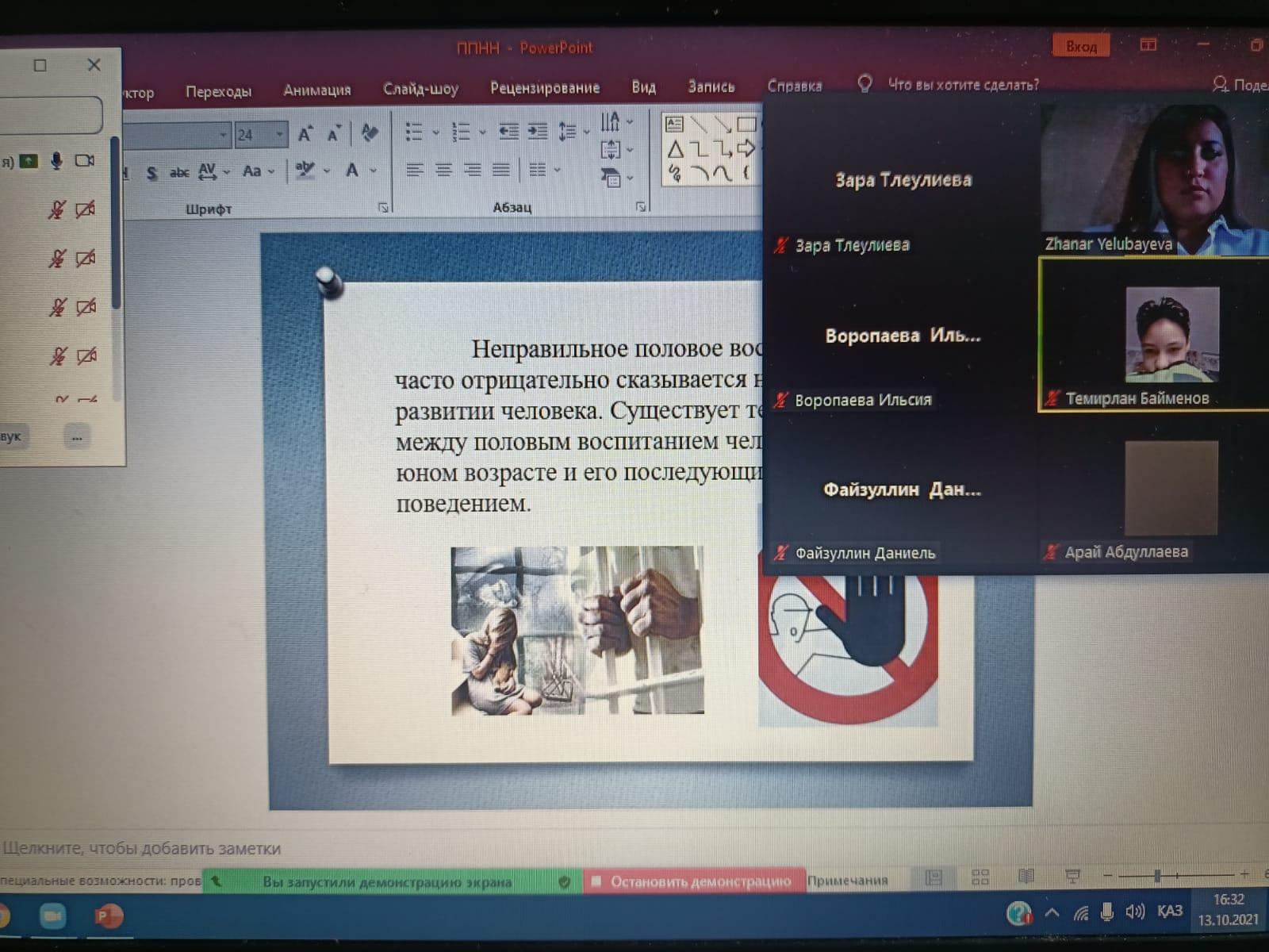 20.10.2021 с психологом школы в целях профилактики половой неприкосновенности несовершеннолетних была проведена онлайн беседа с учениками 8 «Б» класса. Половое воспитание является трудной и сложной задачей, поскольку сочетает в себе элементы морального, этического и гигиенического воспитания. Дети и подростки предоставлены сами себе и той информации, которая на них обрушивается с экранов телевизоров и интернета, которая пропагандирует аморальное поведение среди молодежи.