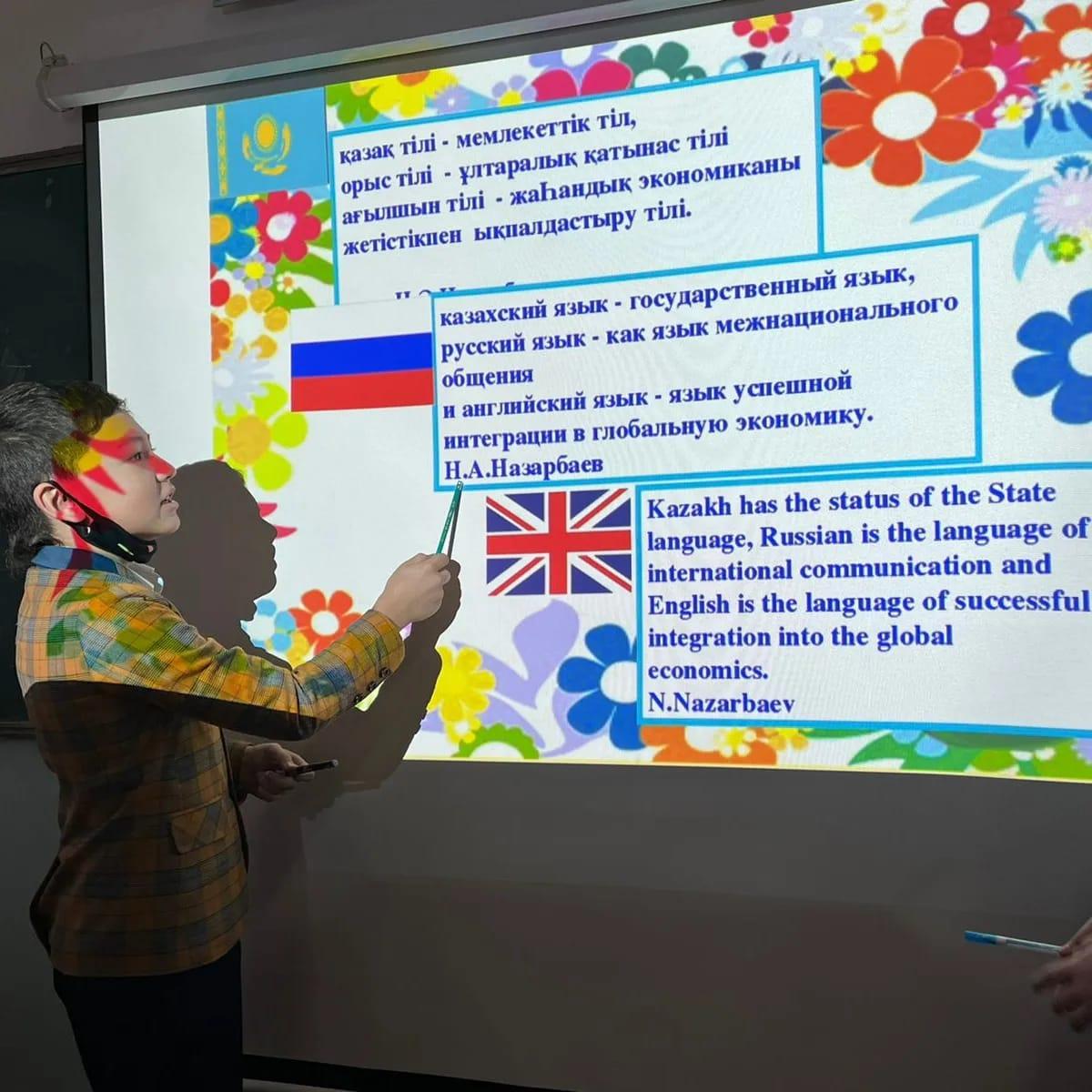 По направлению «Национальное воспитание» в 5 «А» классе было проведено внеклассное мероприятие на тему: «Трёхъязычие - залог светлого будущего». Цель мероприятия: формирование у учащихся положительного отношения к изучению языков, выделенных в приоритетах Послания Президента Республики Казахстан 2050.