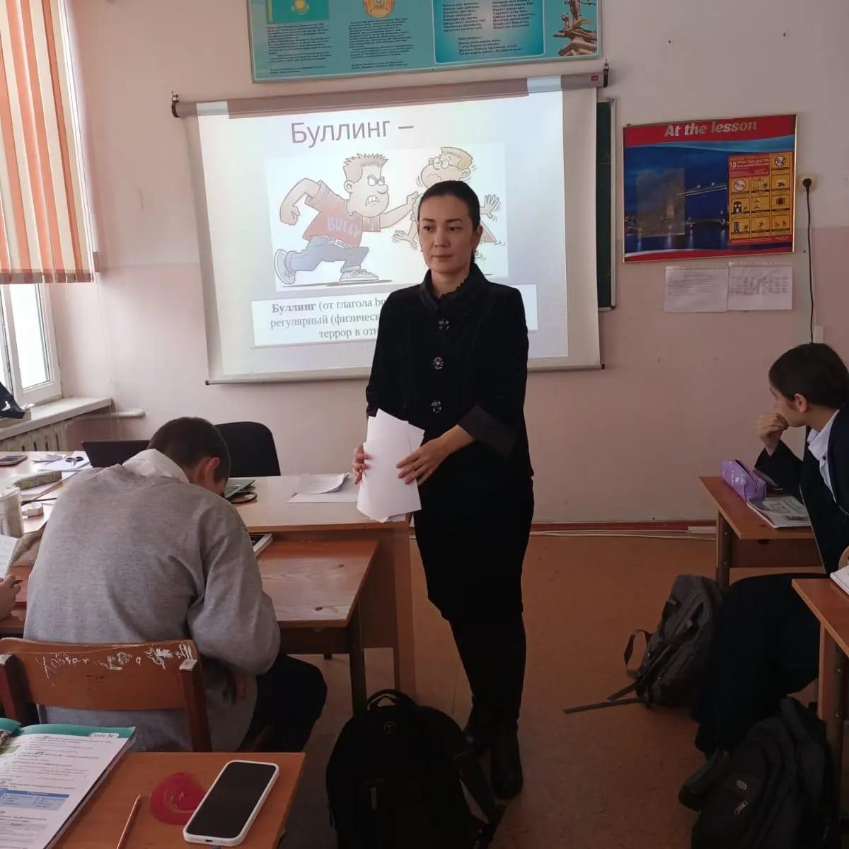 Мусабаева Г.Е. совместно с педагогом-психологом школы Елубаевой Ж.Е. провели беседу на тему "Буллинг"