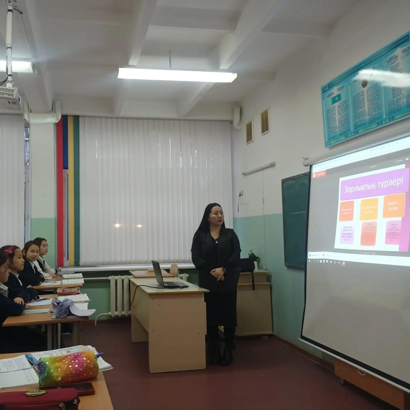 Классный руководитель Кенжалиева С.Ж. провела беседу с учениками на тему "Детство без жестокости и насилия". Цель: повысить информированность общественности, включая взрослых и детей, о проблеме насилия и жестокого обращения в отношении детей, её последствиях для ребёнка и общества.