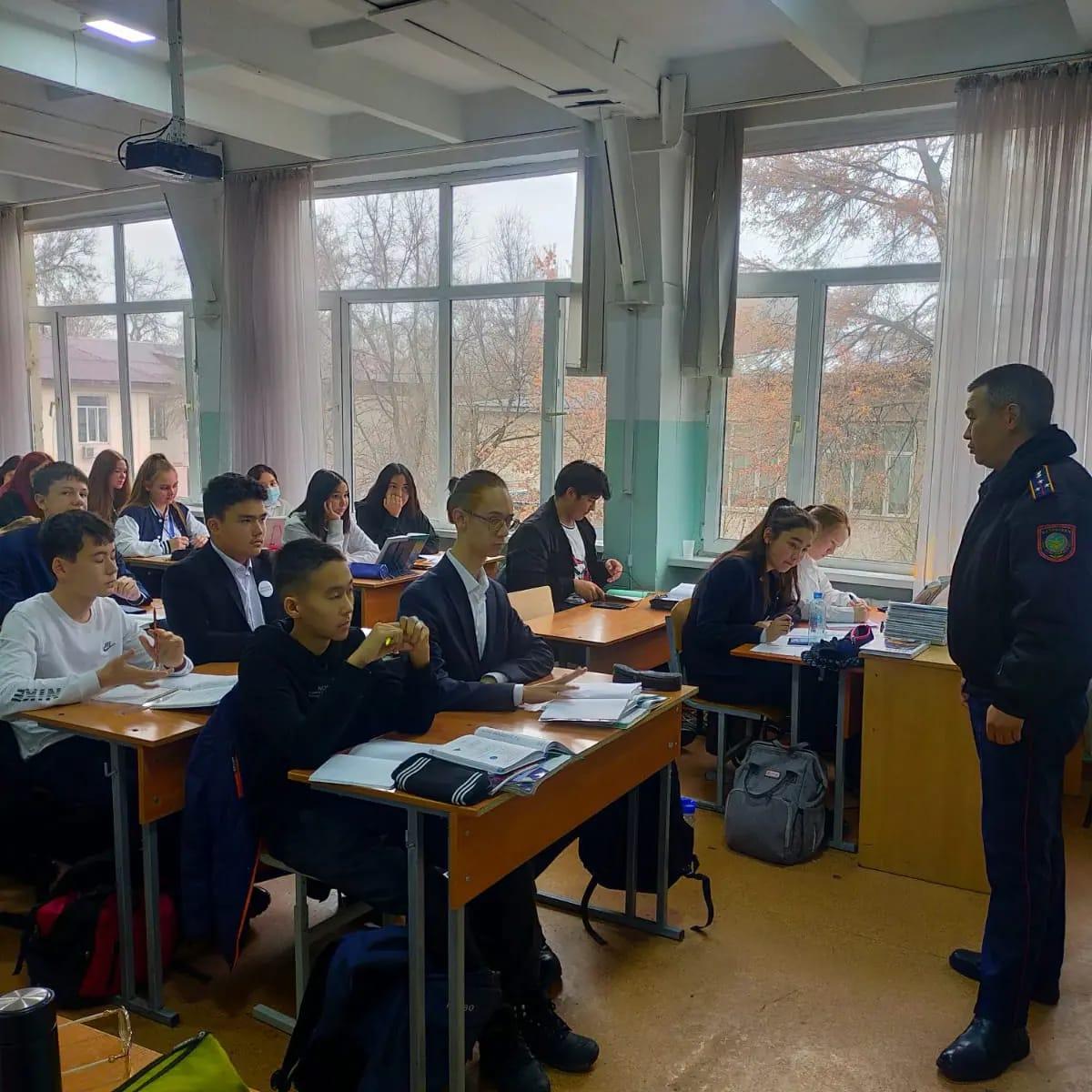 Құқық бұзушылықтың алдын алу бойынша Медеу ауданы ЖПҚ ЮПБ инспекторы полиция капитаны Джумашев Ержан 5-11 сынып оқушылары арасында кездесу өткізді. Оқушыларға мектептің ішкі тәртібімен, кәмелетке толмағандардың әкiмшiлiк жауаптылығы, көшеде, қоғамдық орындарда жүру, зиянды заттардан аулақ болу тәртібімен таныстырып, түнгі сағат 11-ден кейін кәмелетке толмағандардың заңды өкілдерінің еріп жүруінсіз ойын-сауық мекемелерінде немесе тұрғынжайдан тыс жерде болуы бойынша түсіндірме жұмыстарын жүргізді.