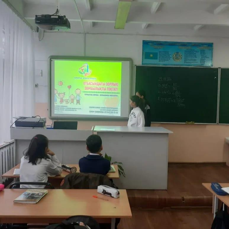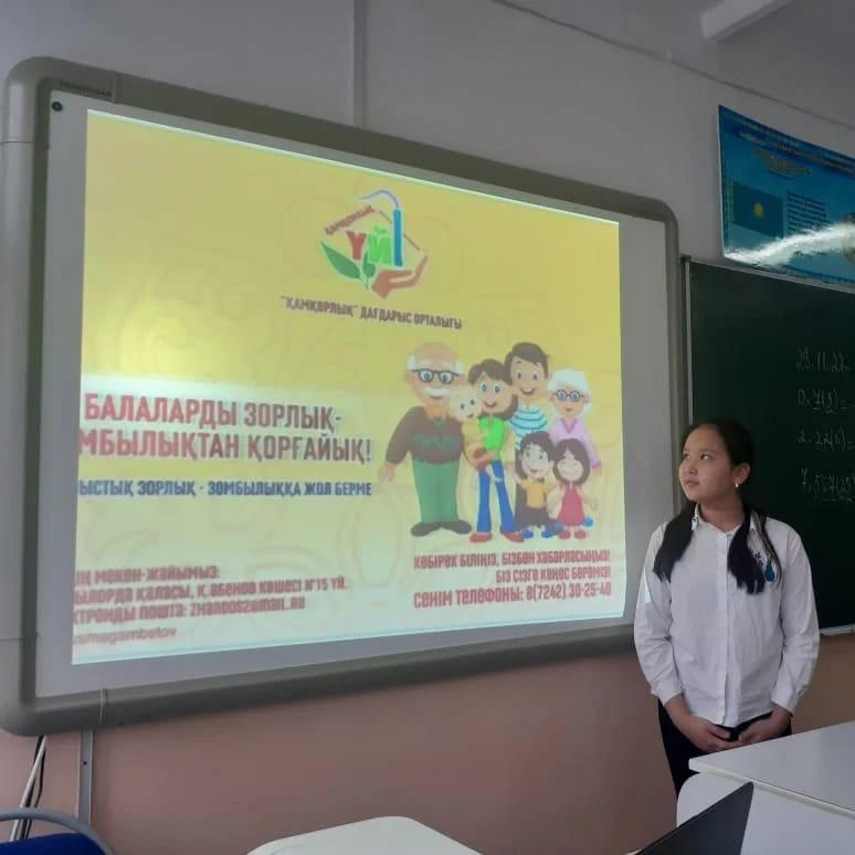 Классный руководитель Байденова С.Қ. провела классный час с учениками 6 "Ә" класса на тему "Детство без жестокости и насилия". Цель: повысить информированность общественности, включая взрослых и детей, о проблеме насилия и жестокого обращения в отношении детей, её последствиях для ребёнка и общества.