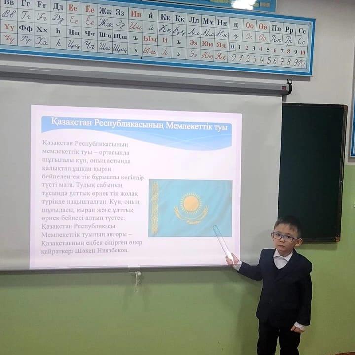 Елтаңба, ту, әнұран туралы түсініктерін нығайту және рәміздіердің пайда болуы мен тарихтағы маңызы жайлы түсініктерін дамыту мақсатында 1 “Ә” сыныбында “МЕМЛЕКЕТТІК РӘМІЗДЕРДІ БІЛЕМІЗ БЕ” тақырыбында сынып сағаты өткізілді.