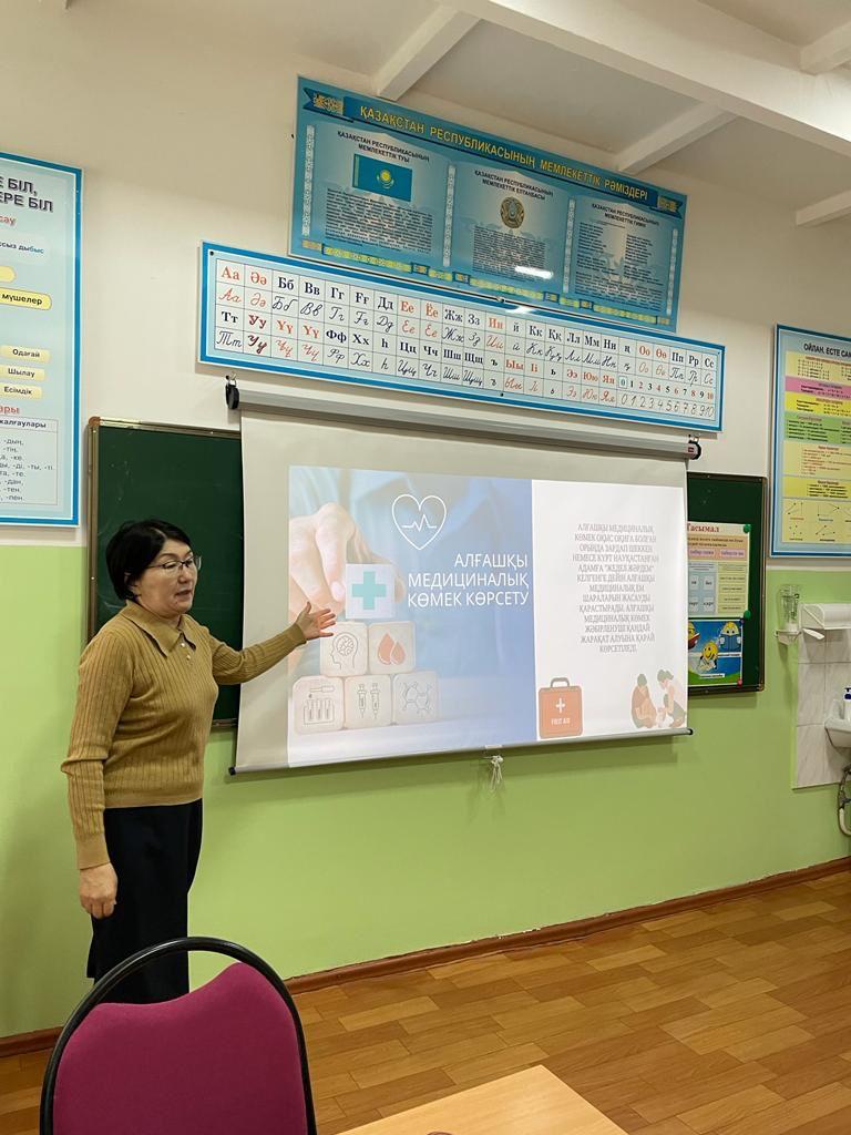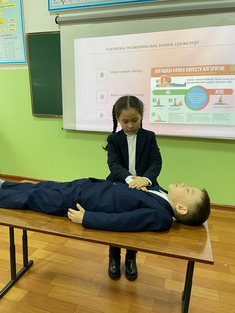 Д.Снегин атындағы №30 мектеп-гимназиясының 1 “Ә” сынып оқушыларымен алғашқы медициналық көмектің практикалық дағдысын қалыптастыру, түрлі жарақат алған кезде көрсетілетін алғашқы көмектің негізгі әдіс-тәсілдерімен таныстыру және адамгершілікке, бір-біріне көмек беруге тәрбиелеу мақсатында сынып сағаты өткізілді. (ЖЖЕ бағыты бойынша)