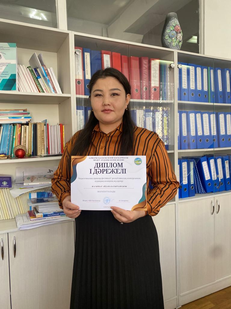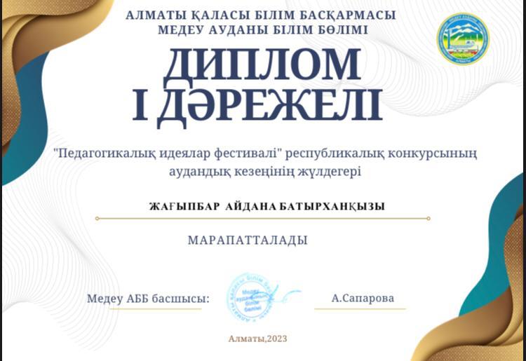 07.02.23 года прошел районный этап Республиканского конкурса "Фестиваль педагогических идей". Учитель биологии Жагыпбар Айдана Батырхановна была награждена 1-м местом и получила путевку на городской этап.