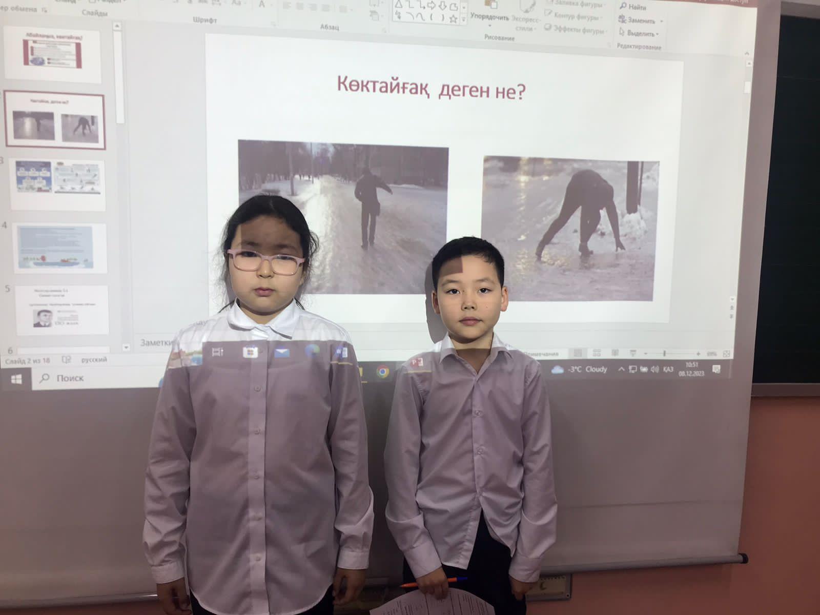 8 желтоқсанда бастауыш сыныптар арасында “Абайлаңыз көктайғақ!” атты әңгіме өткізілді. Балаларға мұзды жолдың қауіптілігі және қозғалыс кезінде сақтық шараларын сақтаудың маңыздылығы туралы еске салынды. Әңгіме сақтық және алдын алу шаралары-көктайғақ жағдайында қауіпсіздікті қамтамасыз етудің ең жақсы тәсілі екенін еске салумен аяқталды.