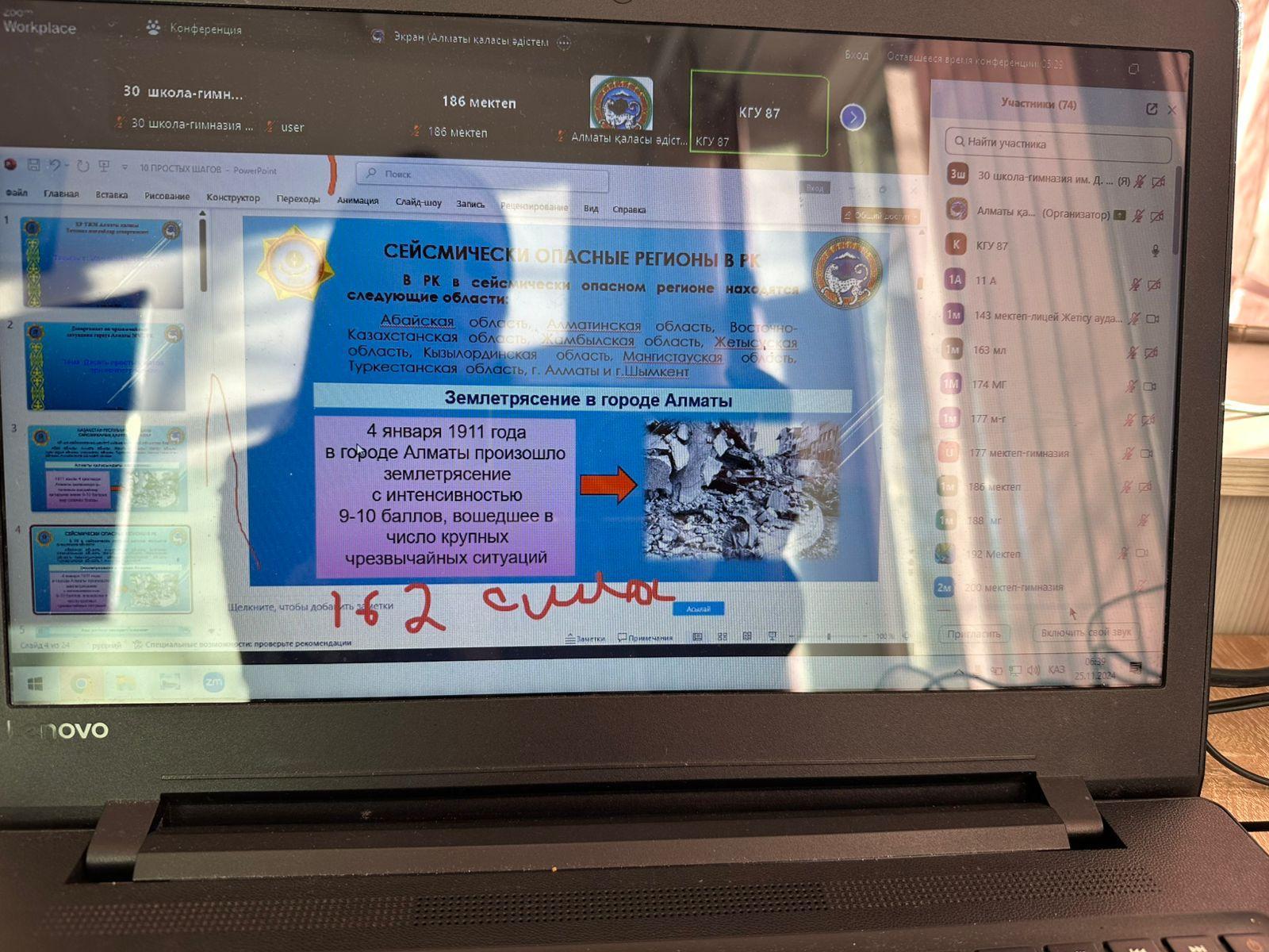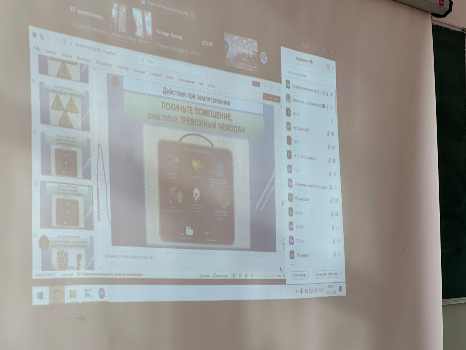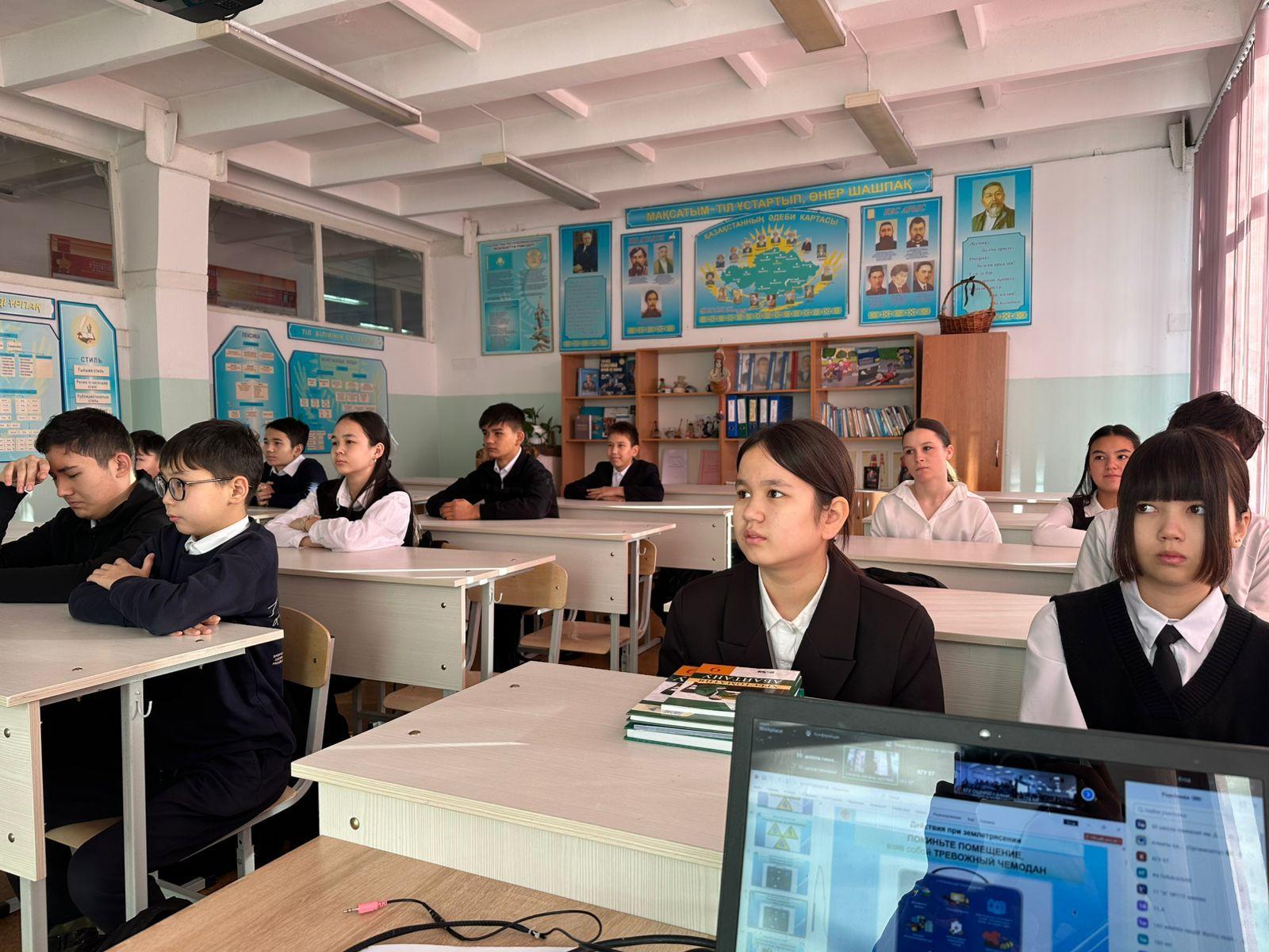 Қараша айының 25 күні ҚББЖТҒӘО Тәрбие бөлімі әдіскері Камшат Қосылжановнаның жүргізуімен "ӨСКЕЛЕҢ ҰРПАҚ АРАСЫНДАҒЫ ҚАУІПСІЗДІК МӘДЕНИЕТІ" ұранымен төтенше жағдайға байланысты оқу сабағы ұйымдастырылды. Іс-шараға мектебіміздің оқушылары қатысып, қажетті ақпараттармен қамтылды.