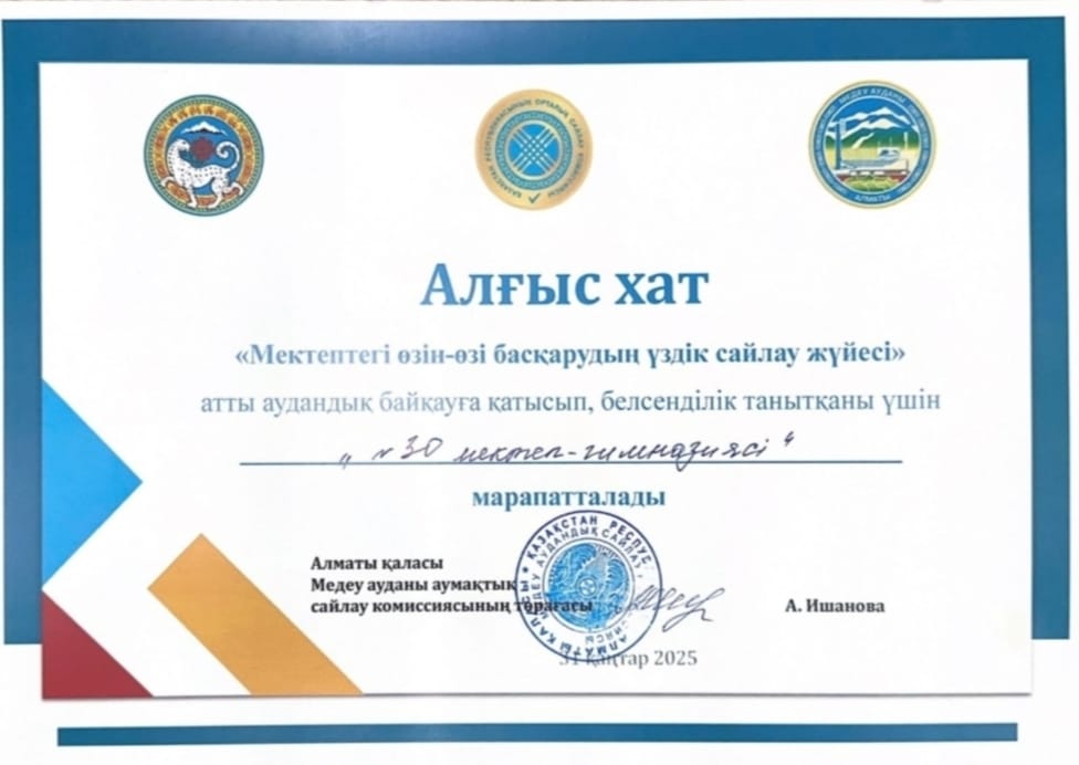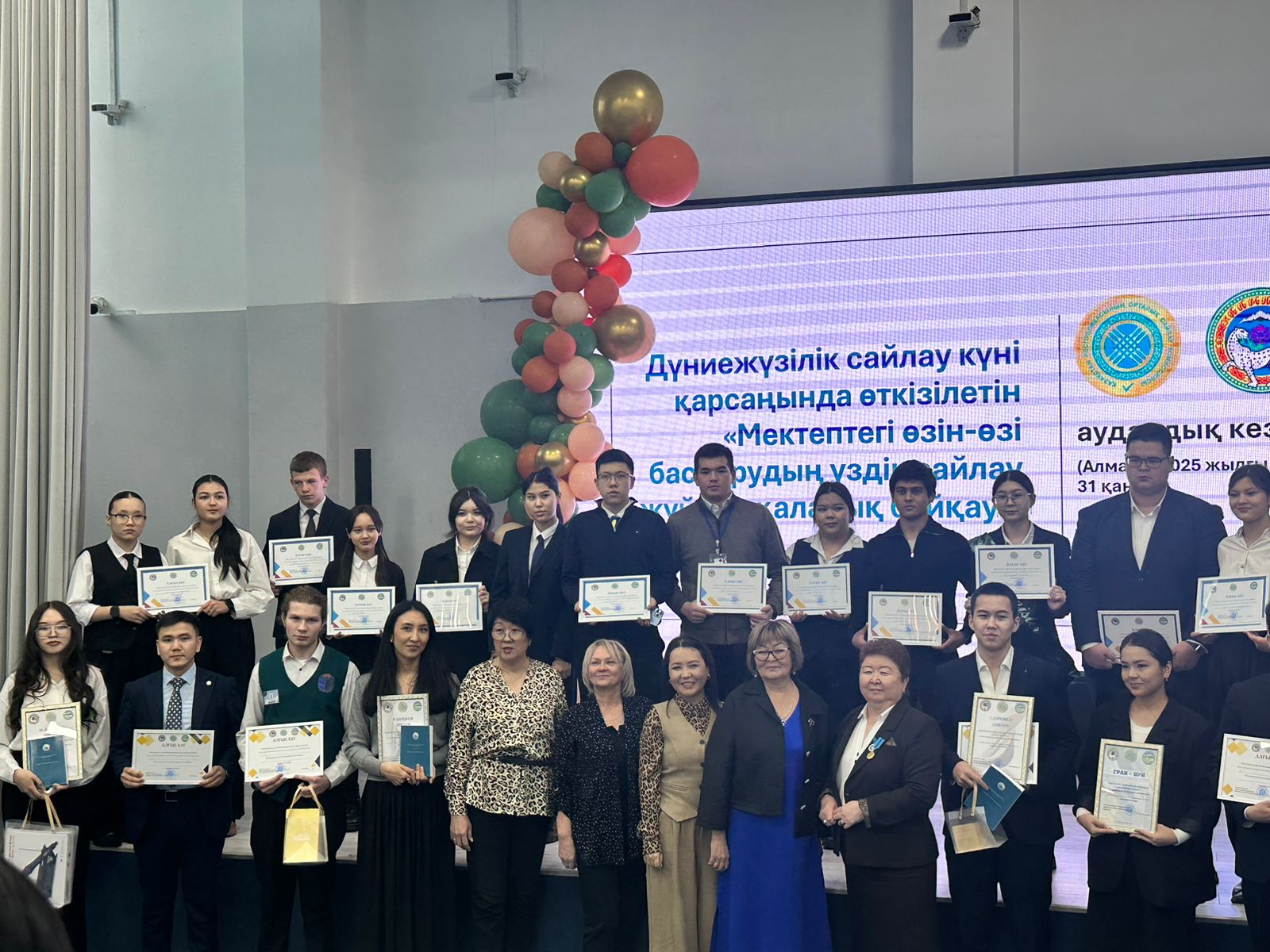 2025 жылдың 31 қаңтарында "Мектептің өзін-өзі басқарудың үздік сайлау жүйесі" аудандық байқауында мектеп президенті: 9