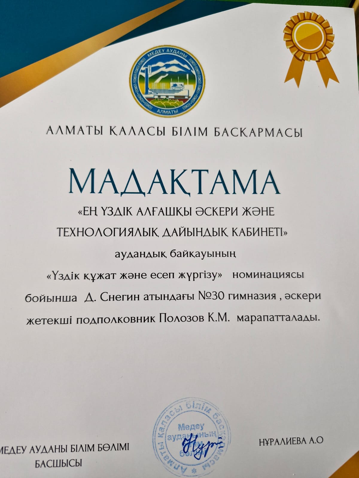 28.02.2025 года в КГУ «Школа-лицей №28 им. М.Маметовой» Медеуского района, г.Алматы состоялось торжественное вручение грамот в районном конкурсе "Лучший кабинет начальной военной и технологической подготовки. В номенации " Документация и отчётность" победил учитель НВиТП школы-гимназии Полозов К.И.