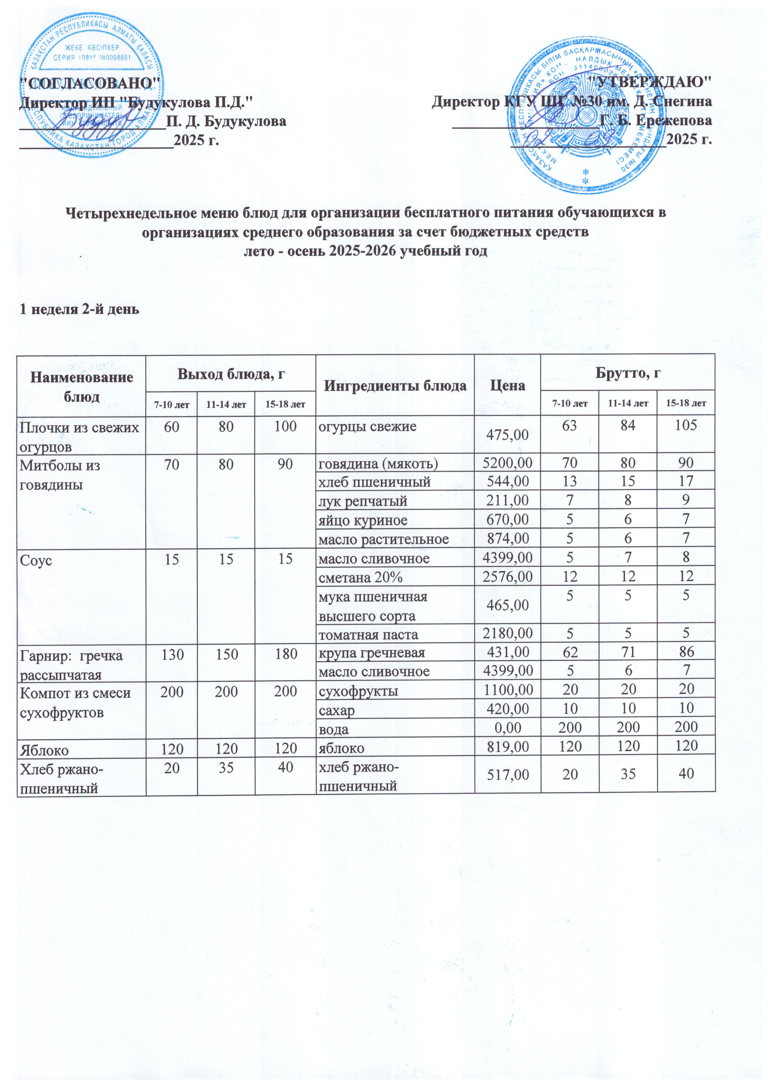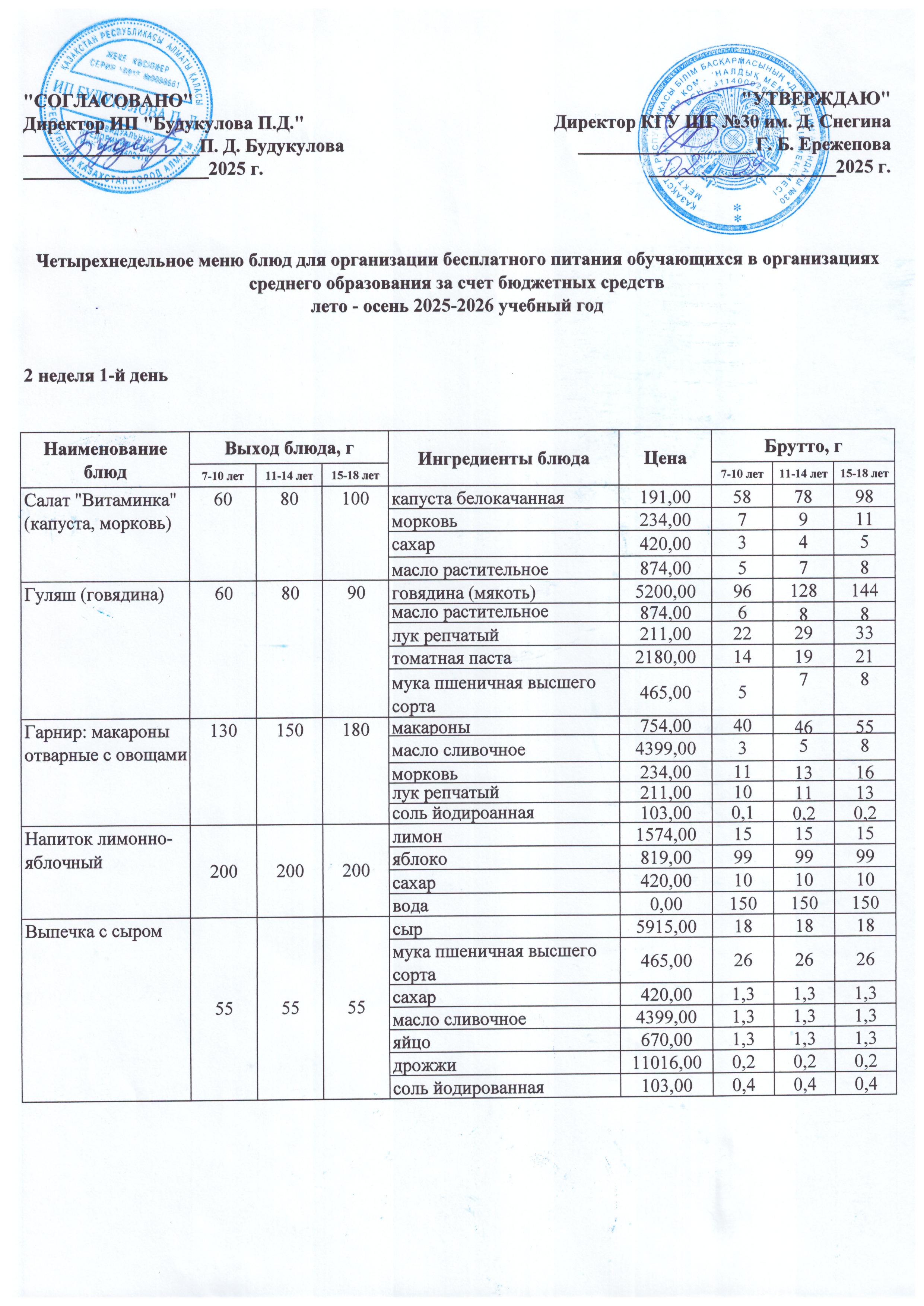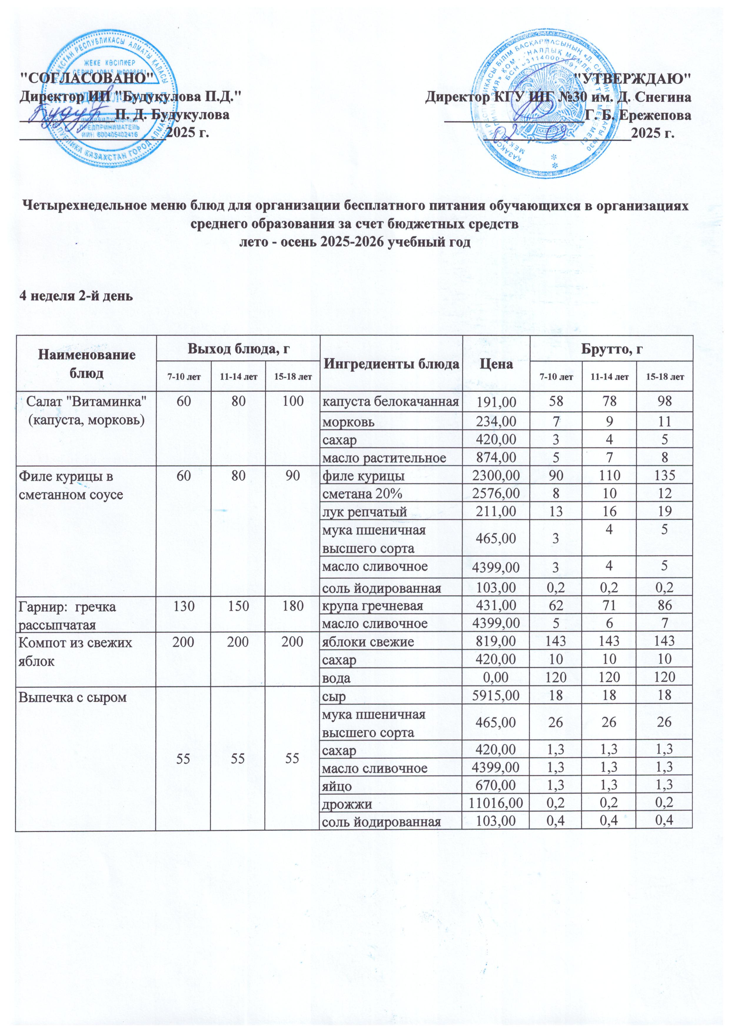 Llетырехнедельное меню блюд для организации бесплатного питания обучающихся в организациях среднего образования за счет бюджетных средств лето - осень 2023 год